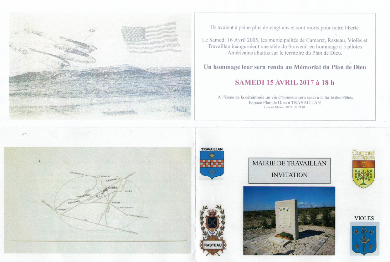 Le 15 Avril 2016, notre association était présente pour la commémoration à la stèle mémorial, érigé sur un terrain mis à disposition par la famille de Jacques MEFFRE, de la 15th Air Force, situé au Plan de Dieu sur la commune de Travaillan, Vaucluse.