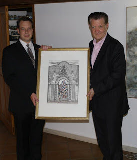 | Jacques Montaignac, responsable du jumelage et David Price, secrétaire générale du comité de jumelage, avec un tableau représentant la ville de Sienne, jumelée avec Avignon |