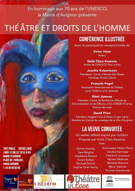 Elles seront ouvertes à tout public et libre d’entrée. Le lundi 13 juillet à 16h; dans la salle d’honneur de la mairie sur la place de l’horloge, «Théâtre et Droits de l’Homme». Seront présents au débat l’auteur Victor Haim, Guila Clara Kessous (UNESCO), Rémi Jumeau (Centre de Rencontres, d’Etudes, de Documentation et de Diffusion d’Oc – CREDD’O) et David Price (Imagine Tours / Radio Coupo Santo et Membre du Comité de Jumelage de la Ville d’Avignon) ainsi que plusieurs autres intervenants. Suivie par un atelier réflexif inspirée de la pièce de Goldoni «La Veuve convoitée» sur la thématique de la Comedia dell’arte. Pour terminer cette conférence un cocktail vous sera offert.