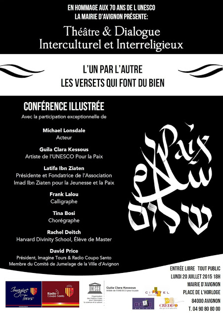 Le lundi 20 juillet à 18h, dans la salle d’honneur de la mairie sur la place de l’horloge, «Théâtre et Dialogue Interculturel et Interreligieux». Seront présents le comédien Michael Lonsdale, la chorégraphe Tina Bosi, Guila Clara Kessous (UNESCO), Rachel Deitch (Harvard University), Latifa Ibn Ziaten (Présidente et Fondatrice de l’Associaton Imad Ibn Ziaten pour la Jeunesse et la Paix) et David Price (Imagine Tours / Radio Coupo Santo et Membre du Comité de Jumelage de la Ville d’Avignon) ainsi que plusieurs autres intervenants. Cette conférence basée sur la thématique «L’Un par l’Autre, les Versets qui font du Bien» sera suivie d’une lecture de versets issus de la Torah, de la Bible et du Coran, ainsi que de poèmes mystiques traitant de l’amour, du respect et du vivre ensemble. Un cocktail vous sera offert pour conclure la soirée.