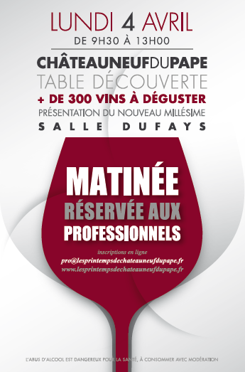 Notre association a répondu oui, à l’invitation de la Fédération des producteurs de Châteauneuf-du-Pape à participer à la «Matinée Professionnelle» lors de l’événement «Les Printemps de Châteauneuf du Pape 2016» le 4 Avril 2016.